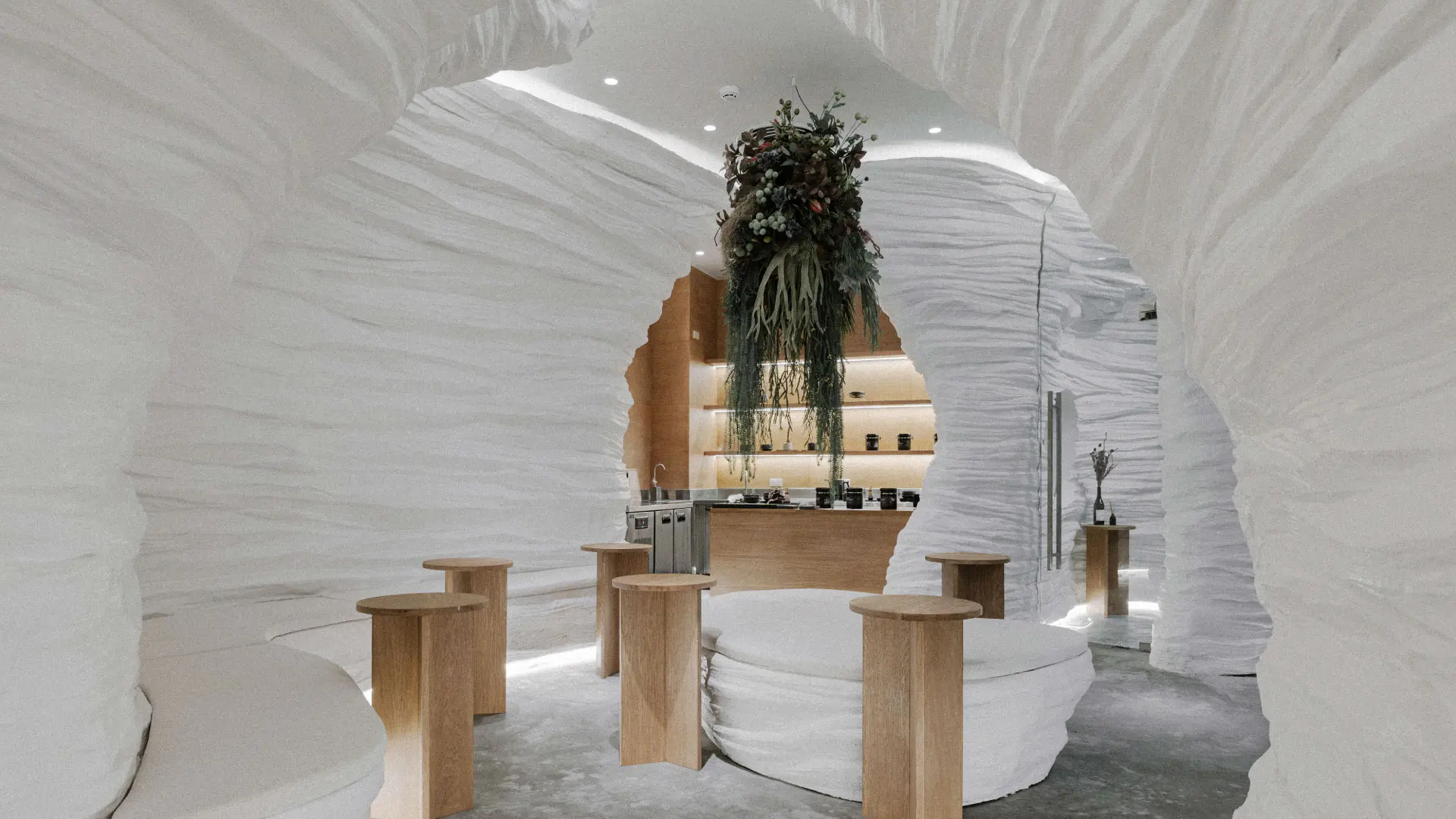 Ao passar pelas portas de vidro da entrada dessa casa de chá, o visitante vai entrar no espaço que se assemelha a uma caverna. As paredes do Kasana se assemelham a paredes de rochas (tendo, inclusive, muita textura). Contudo, elas são brancas e isso deixa o ambiente mais leve.